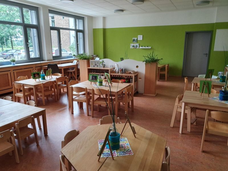 In unserer Einrichtung erhalten die Kinder mit Übermittagsbetreuung ein warmes Mittagessen. Das einladende Kinderrestaurant mit kleinen Tischgruppen ermöglicht den Kindern das Mittagessen in familiärer Atmosphäre einzunehmen.